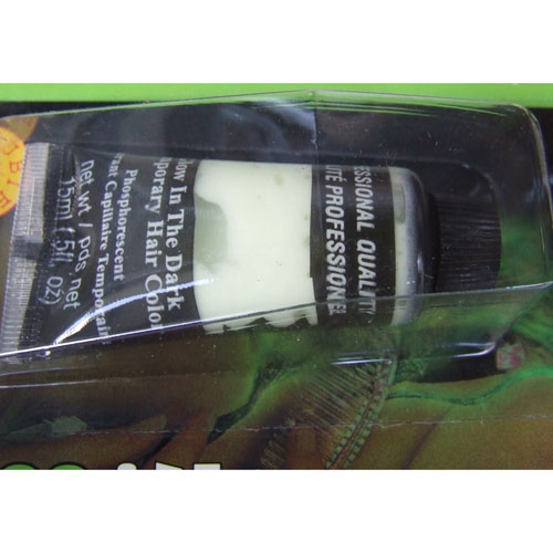 究極のグローヘアカラー!GLOW IN THE DARK HAIR COLOR☆ 髪の毛が怪しくグローに輝きます。 通常の蛍光灯に数分間当てると、暗闇で緑色に光ります。 さらに「BLACK LIGHT」ブラックライトに当てると光り方は更に倍増します。 クラブ、ハロウィンパーティー等には外せないグローヘアカラーです。