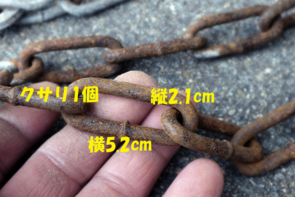 - 約:全長(フック部含む)4メートル クサリ1個:縦2.1cm 横5.2cm