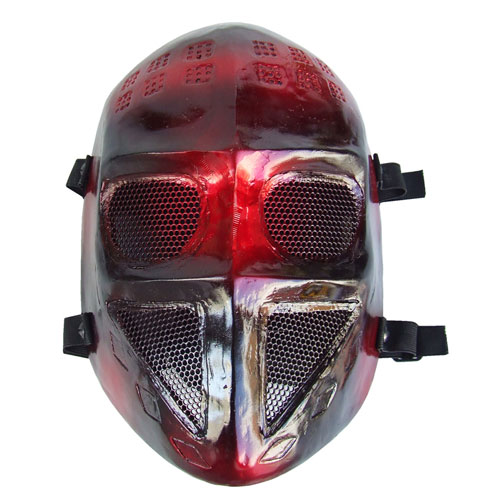 ダメージコーディングを施し、グラスファイバー(ガラス繊維) で出来た威圧感ある戦武面・スカルバトルスタイルマスク☆ グラスファイバー素材だから高強度、耐衝撃性に優れ、型崩れ無し!! 装着すると顔にフィットします。 ホラーコスチュームに合わせて活躍させて下さい。 また、ミリタリーマスク、サバイバルゲーム用マスクとしても可能です。 メッシュ部分は金属になっていますから、BB弾から目を保護します。 お好みに合わせてご利用下さい。