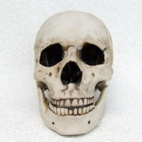 ホラー要素を漂わせるホモサピエンススカルヘッド!! 進化の過程として「原人→旧人→現生人類」。 現生人類「ホモ・サピエンス」はラテン語で「知性あるヒト」の意味。 洞窟の奥深く土に埋もれてそうなアイテム☆ アゴを取り付けたり、外したり、お好みの雰囲気に合わせて御利用下さい。 ホラー装飾としても十分活躍しますよ♪ スカルヘッドコレクションに追加してみてはいかがですか☆
