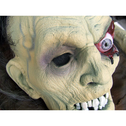 残忍な魔女の前に痛ましいゾンビヘッドが置かれた「Hoo Doo Display」 むき出した目がリアル過ぎるゾンビヘッドは、バイブレータユニット仕様で、 ACコードをコンセントに差し込むだけでブルブルと振動します。 間接照明などを上手く利用して、さらなる恐怖を与えてみてください。 振動させなくても十分アイキャッチになる演出効果抜群の ホラーディスプレイです。